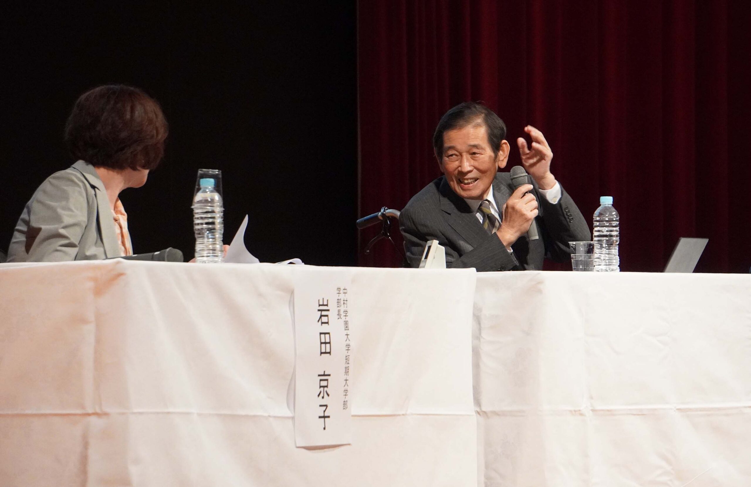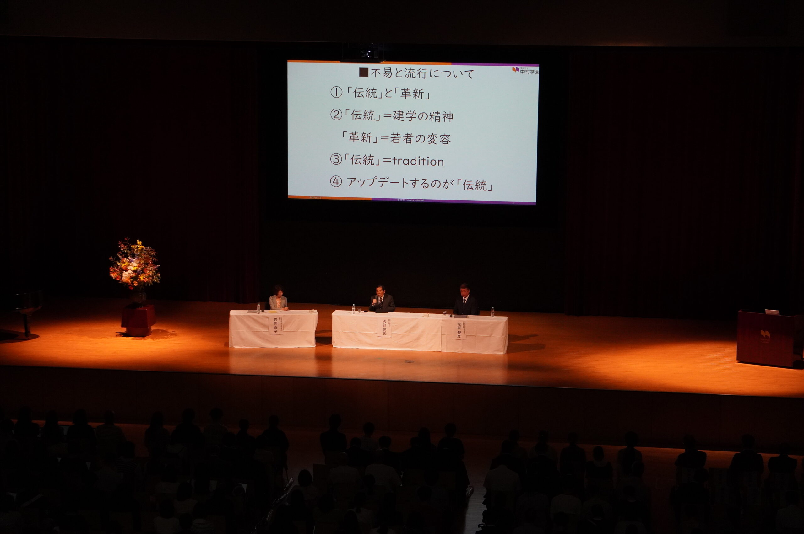 最後に、お二人に学園創立から今も受け継ぐ建学の精神についてお話しいただきました。世界の中での日本人としての自覚、言葉の力、剣道における礼節、周囲への感謝の心など具体的なエピソードを交えながら対談され、「根っこと翼をもった若者になってほしい」と聴講に集まった多くの若い参加者に激励の言葉を贈られました。