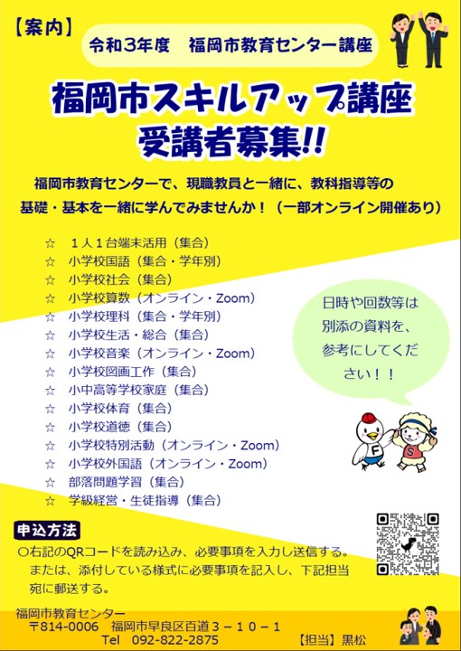 福岡市スキルアップ講座では、現職の先生方と共に授業改善に向けて、一緒に学ぶことができます。