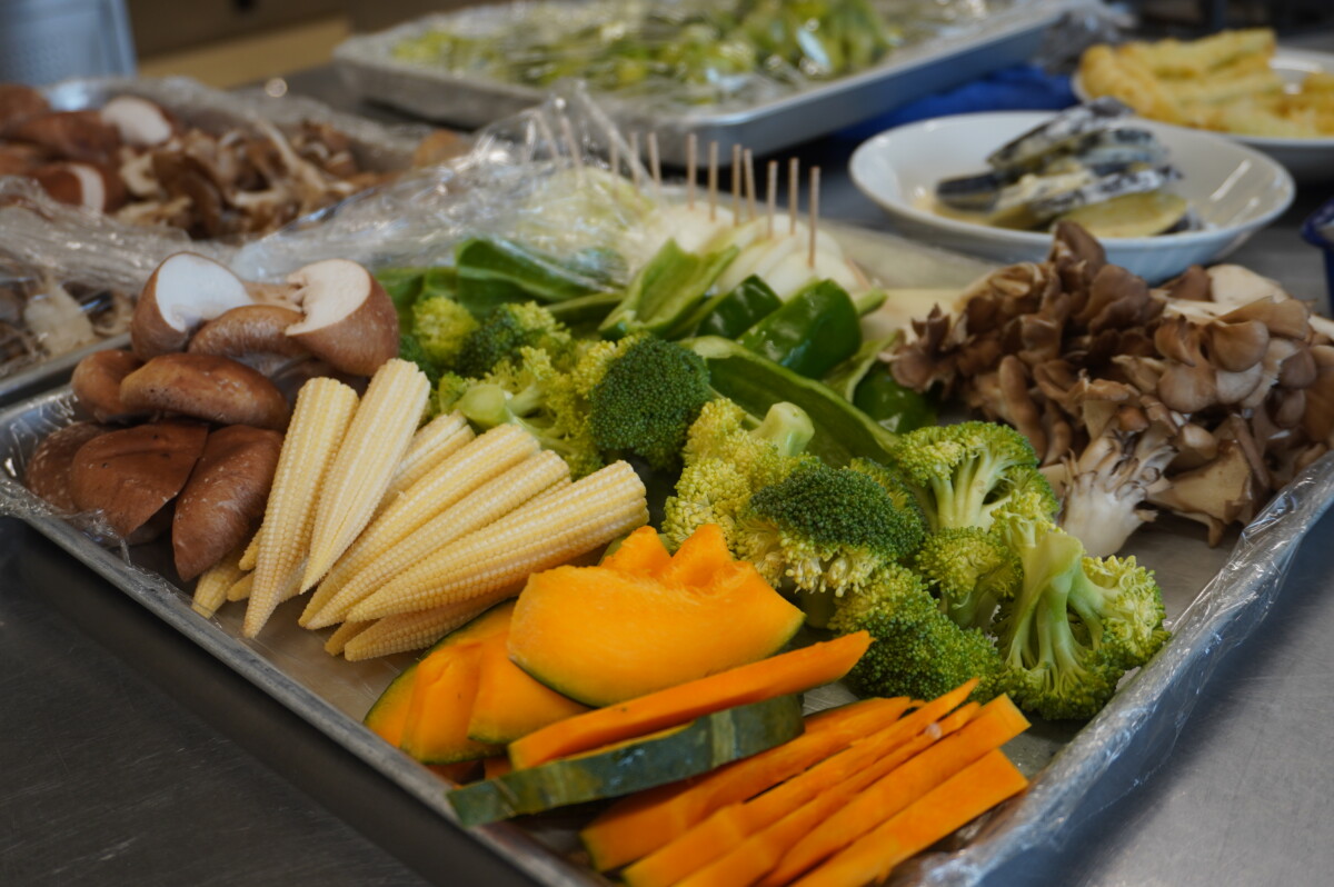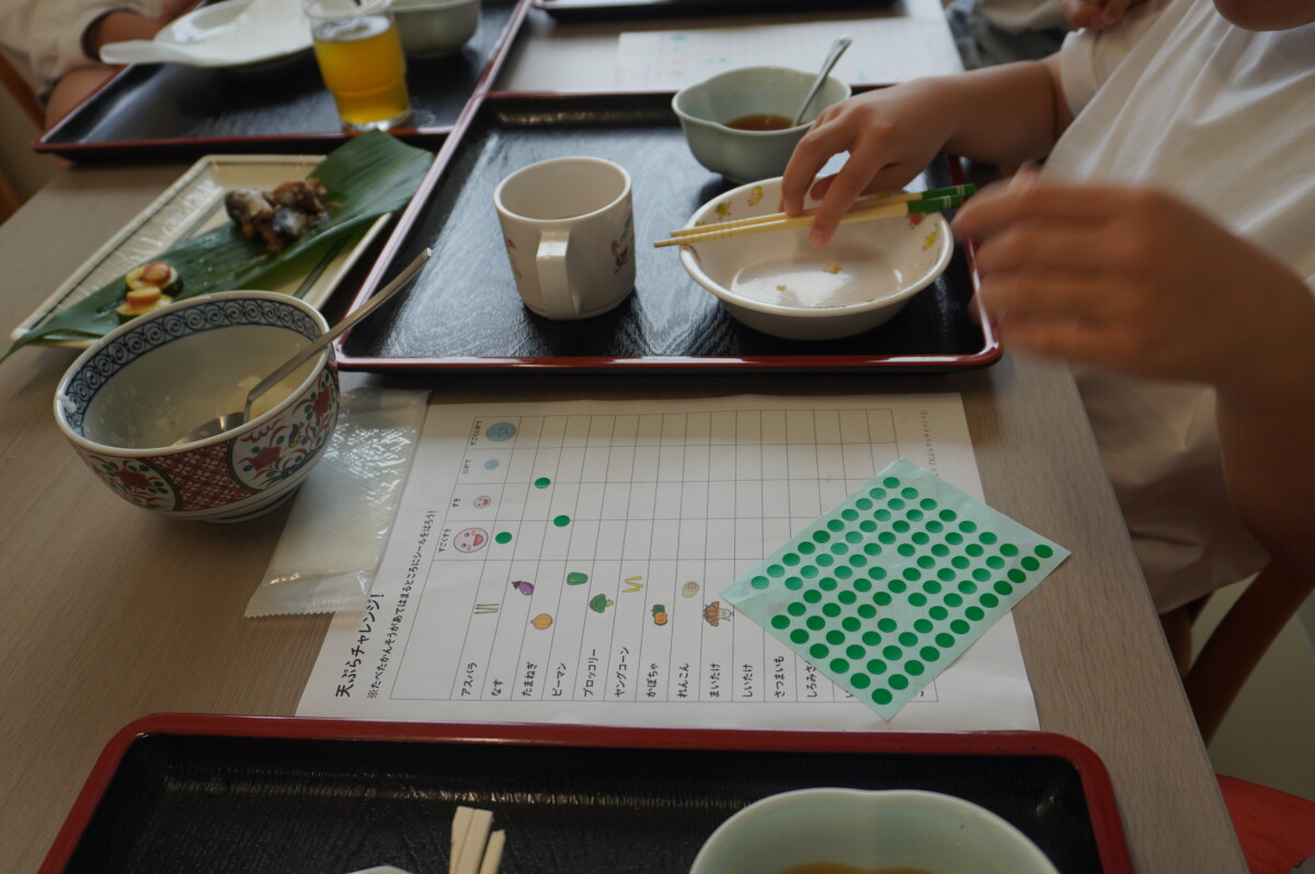 今回のランチでは、「天ぷらチャレンジ」として、15種類の野菜・魚・エビなどの天ぷらを提供。天ぷらだけで174グラムもの野菜が使用されており、参加者は楽しみながらたくさんの野菜をとることができました。「チャレンジシート」に1品ずつ、好きの度合いを子どもたちにも回答していただき、子どもの食事を考えるうえでの貴重なデータを回収することもできました。