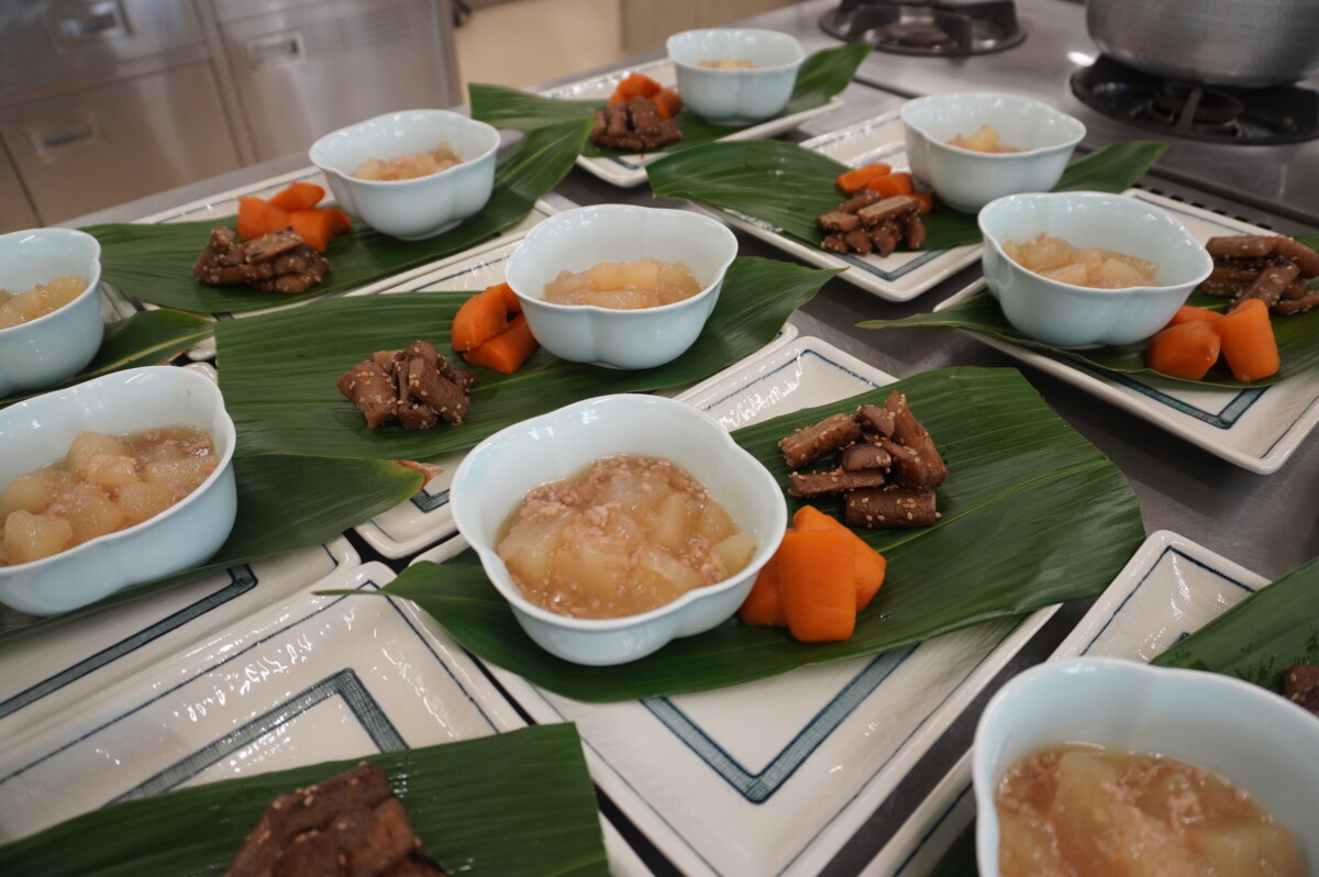 また、小骨の多い魚や固い根菜類は、子どもが苦手としがちな食材ですが、子どもの食べる機能の発達に配慮し調理した「骨ごと食べるいわしの梅煮」や「にんじん甘煮」、「丸ごとごぼうのきんぴら」、「冬瓜のそぼろ煮」は、いずれも食べやすいように柔らかく調理されており、子どもたちが喜んで食べる姿が見られました。