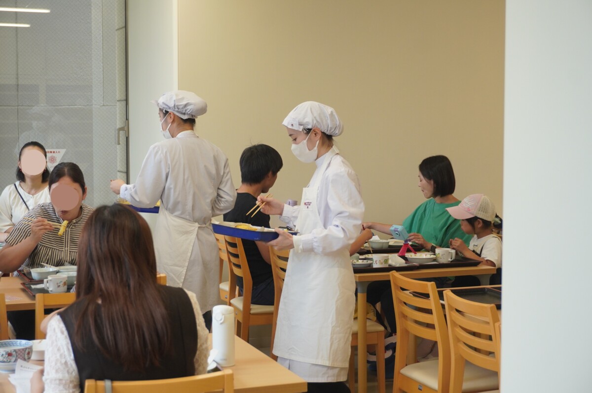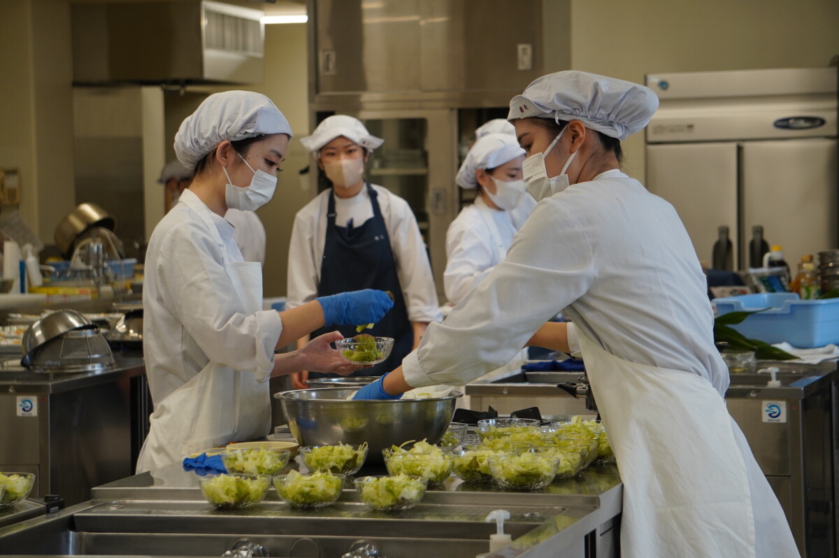 本イベントは、昭和産業様が掲げる「伝統的な天ぷら文化の普及」の目的のもと、家族で楽しく旬の野菜を味わうことをテーマに企画されたものです。10組の親子が参加し、昭和産業様からのお話のあと、学生が考案した天ぷら・ご飯・吸い物・小鉢などを組み合わせた特製ランチをめしあがっていただきました。