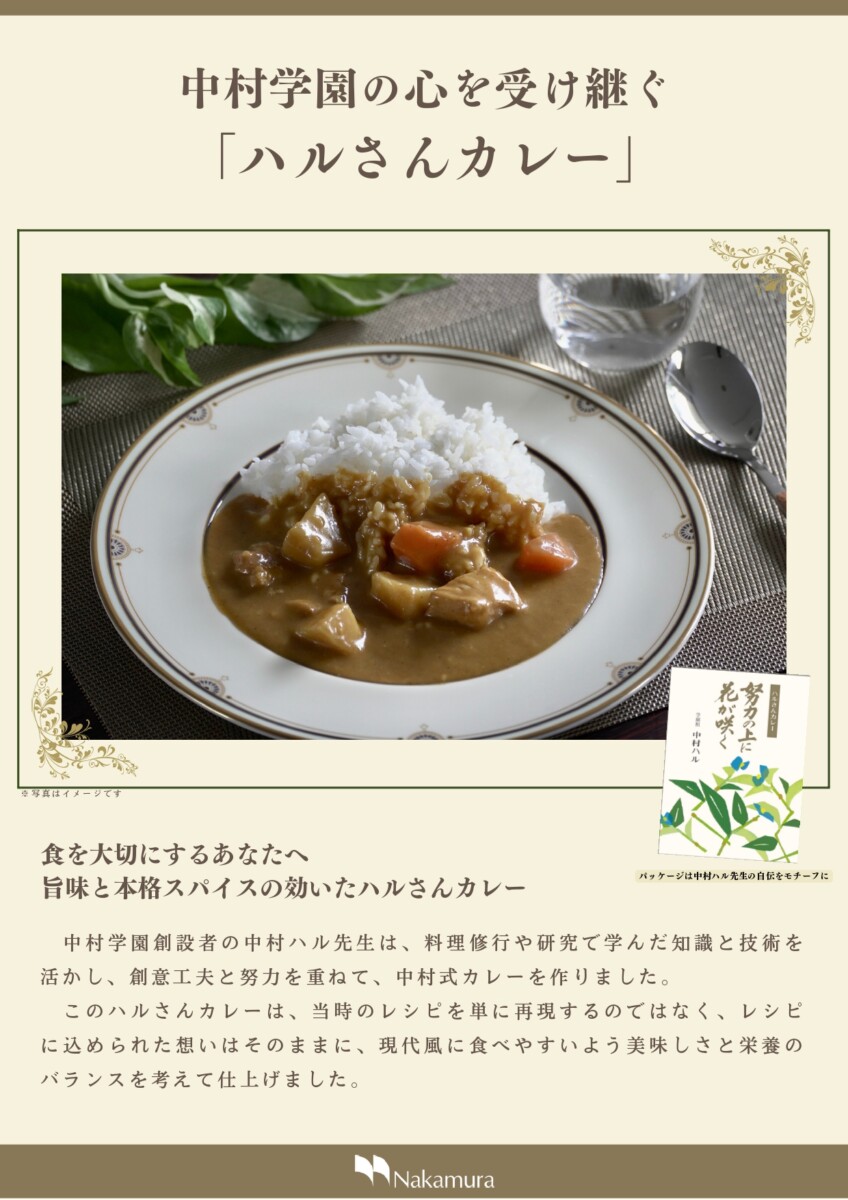 中村学園創設者の中村ハル先生は、料理修行や研究で学んだ知識と技術を活かし、創意工夫と努力を重ねて、中村式カレーを作りました。