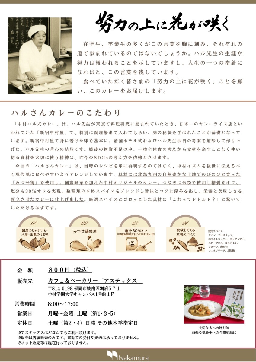 具材には、みつせ鶏と国産野菜を使用し、数種類の本格スパイスをブレンド。旨味とコクに深みを出し、栄養と美味しさを両立させた中村オリジナルのカレーに仕上げています。詳細は下記チラシをご覧ください。