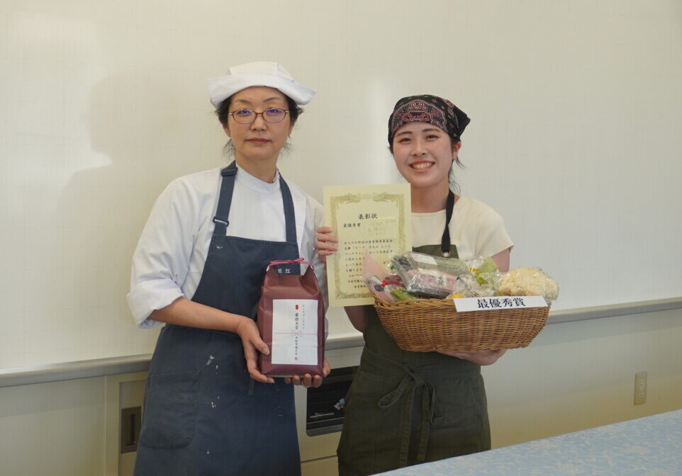 最優秀賞受賞の秦 萌々子さんは、「地産地消や手軽さというところに着目し、自宅で採れた野菜や梅干しを使うことで材料費を抑えました。また、誰でも作ることができるように、調理方法を簡単にしました。自分でレシピを考え、誰かに食べてもらうという経験も貴重でしたが、最優秀賞をいただけたことでさらに良い経験になりました。」と言って喜んでいました。