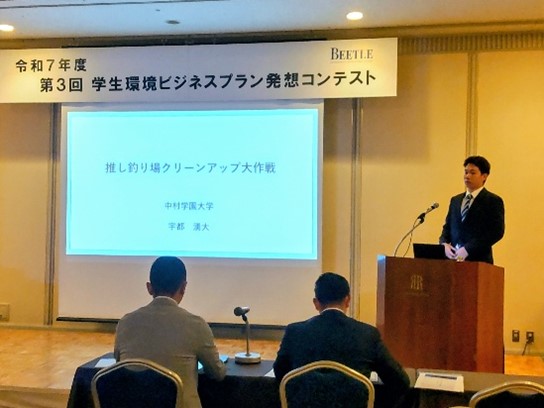 本学からは流通科学部3年の宇都湧大さんが本選に出場しました。宇都さんは、趣味の魚釣りを通じて日頃から関心を抱いていた海洋ごみ問題を、釣り人・釣具店・西原商事(廃棄物処理・資源物リサイクル事業者)がタッグを組むことにより広範囲・継続的な環境活動として実現する「推し釣り場クリーンアップ大作戦」という環境ビジネスプランを提案し、「審査員特別賞」を受賞しました。