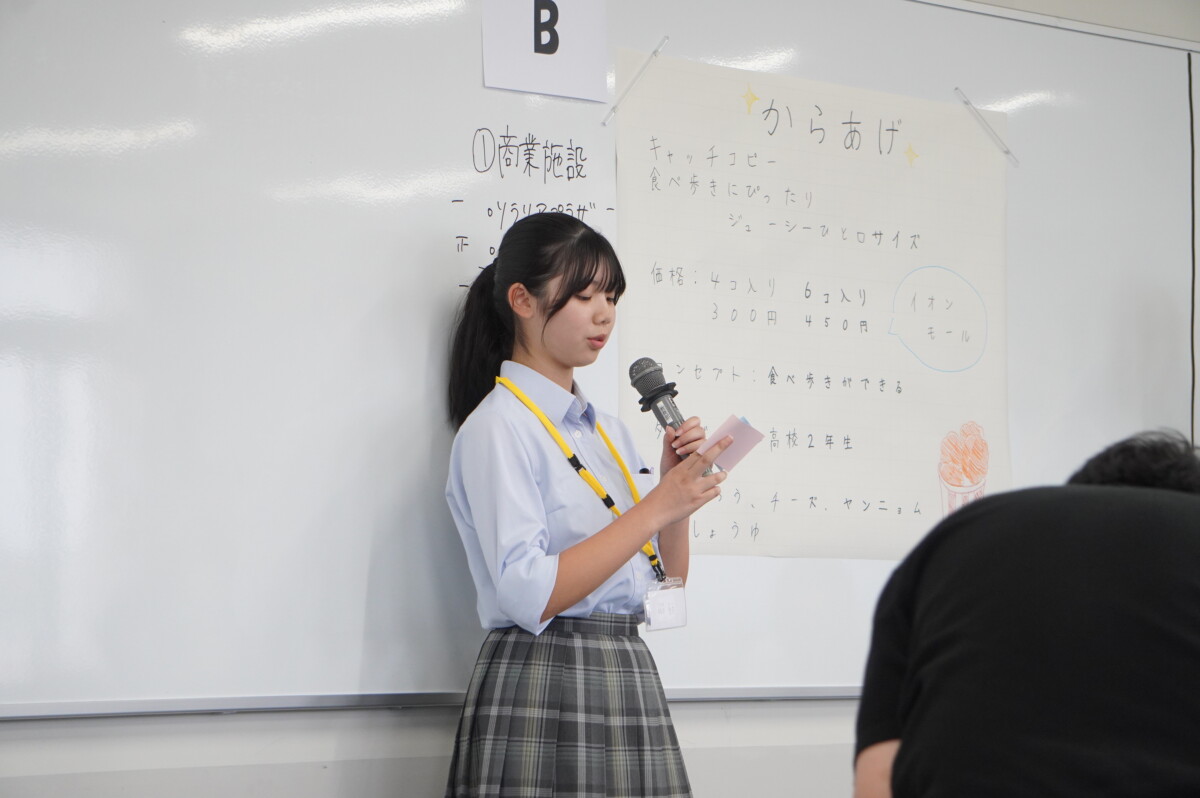 グループ発表では、ご当地グルメをテーマにした企画や、テーマパークで販売するスイーツの提案など、多彩なアイデアが発表されました。