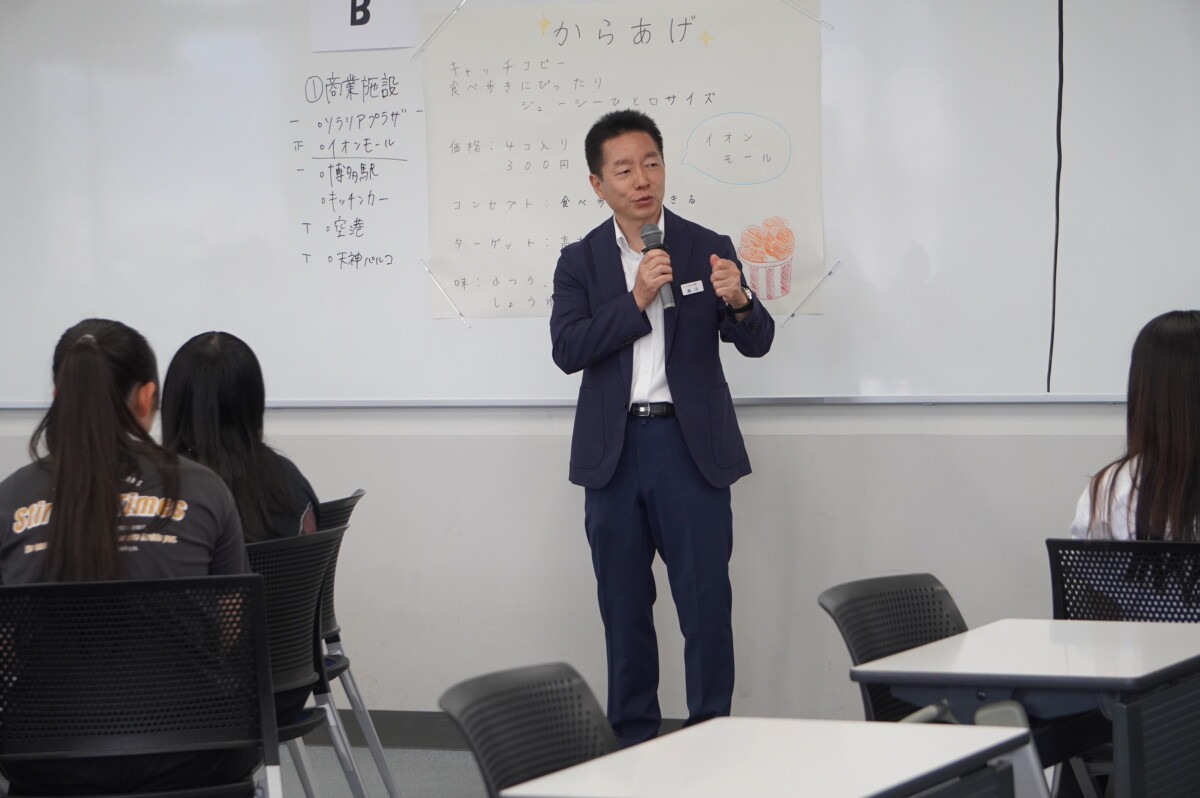 眞次ゼミの4年生は、先日、福岡市内の商業施設で2日間限定のスイーツショップを企画・運営しました。イベントの冒頭では、ゼミ生の代表がその取り組みについて、企画から販売までの流れや、そこから得た学びを発表しました。