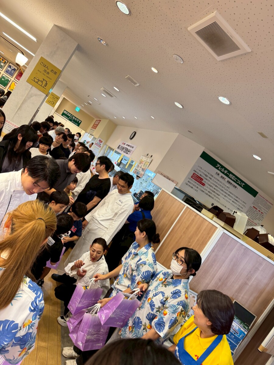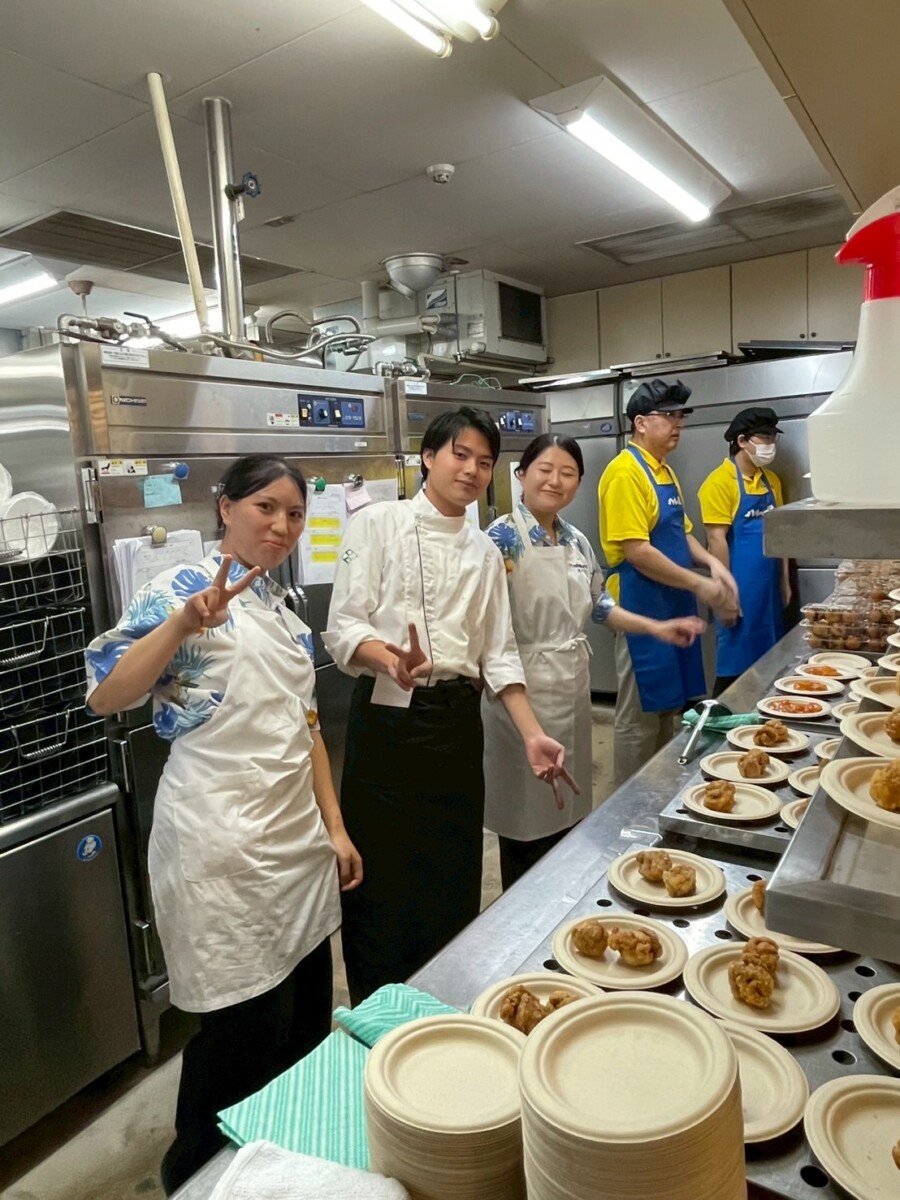 240名を超える子どもたちに博多食文化の会シェフたちが様々な料理を提供し、学生たちは主に食事のサービング補助を行いました。