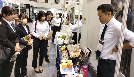 会場では多くの企業が試食を通して自社の商品を積極的にアピールしており、その場で商談が始まっている様子も見ることができました。人の流れが絶えず、企業とバイヤーが直接交流している姿がとても印象的でした。また、出展企業の多くが大企業ではなく、従業員数6名ほどのこんにゃく屋さんや、30年以上続く寿司屋が新たに調味料販売に挑戦するなど、地域に根ざした中小企業が多いことにも驚きました。
