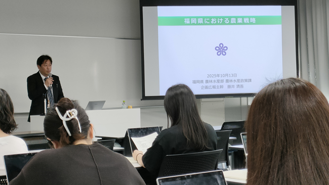 農業者による多角化型であれ、農商工連携型であれ、6次産業化の出発点は農業・農産物です。この貴重な地域資源である農産物を生み出す農業を次世代にわたって発展させる「福岡県における農業戦略」について、福岡県庁農林水産部農林水産政策課の藤井清吾 企画広報主幹を特別講師にお迎えして学びました。