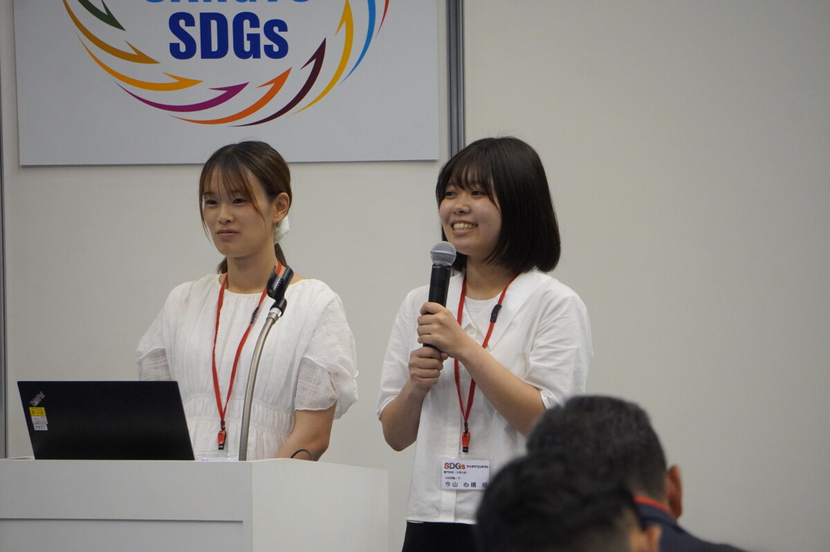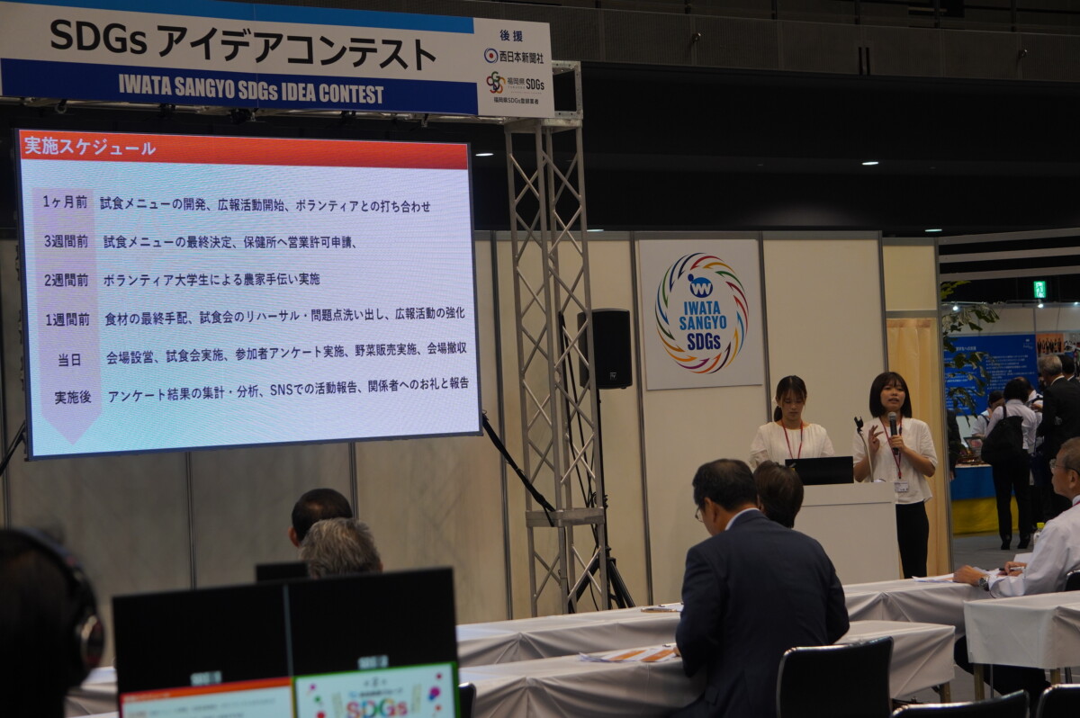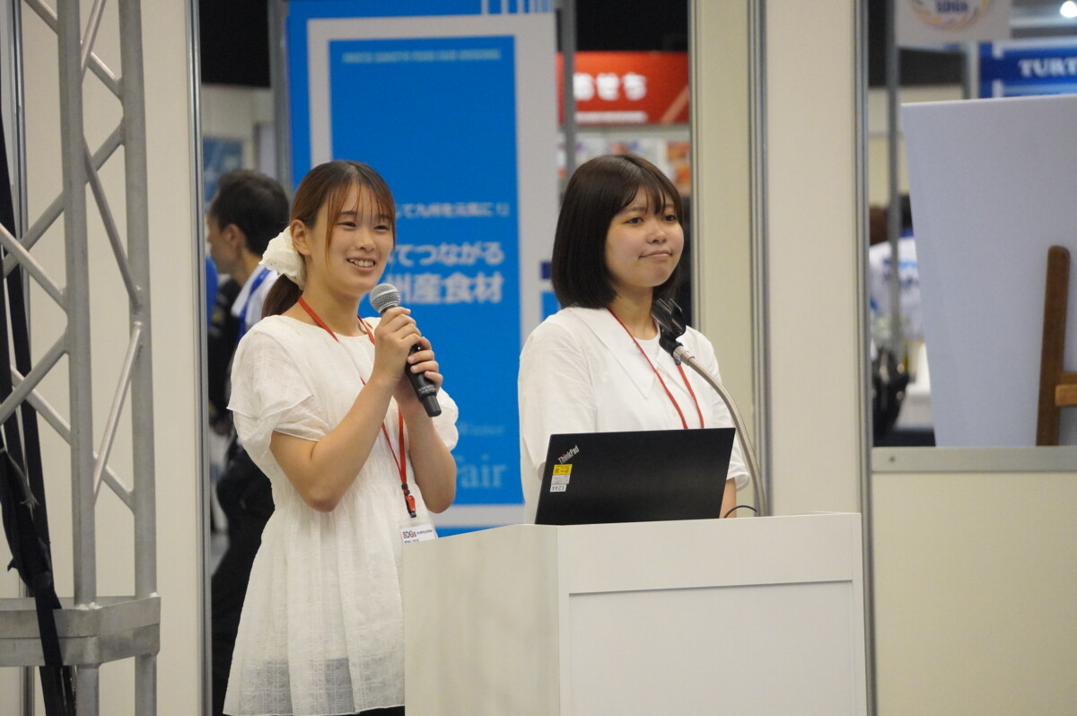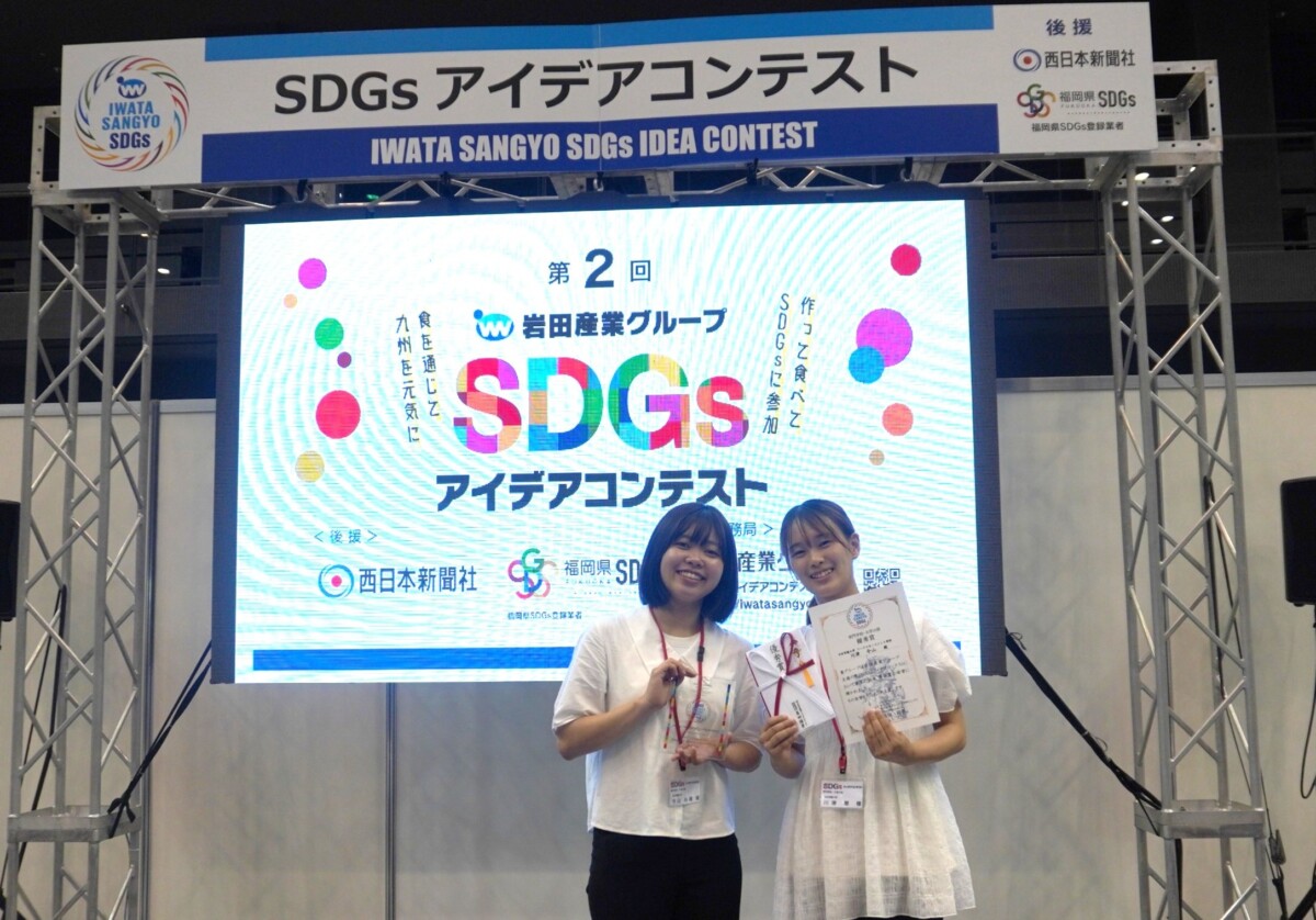 9月18日、マリンメッセ福岡で開催された「第2回 SDGsアイデアコンテスト」(主催:岩田産業グループホールディングス)において、フード・マネジメント学科1年生の今山 心晴さんと川津 葵さんが優秀賞を受賞しました。