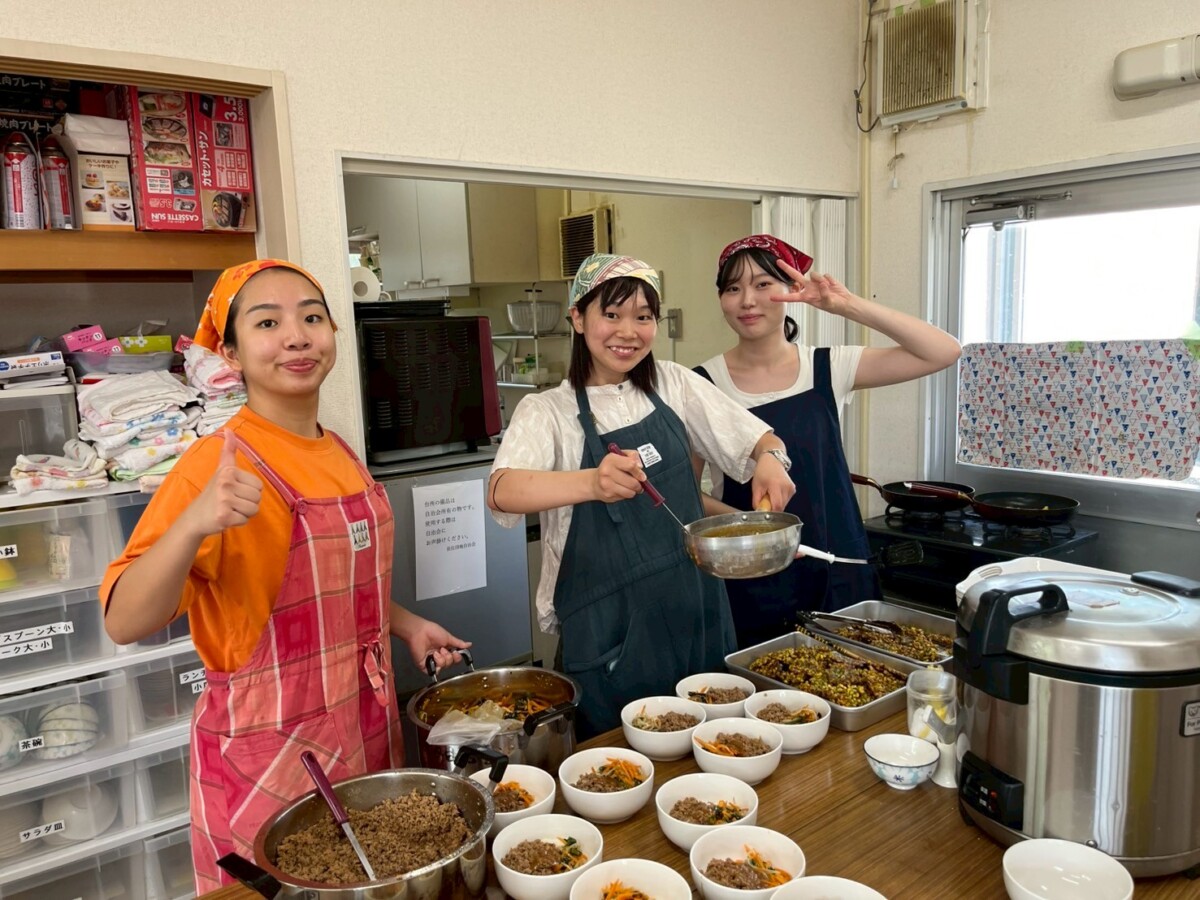栄養科学部栄養科学科・内田ゼミでは、春休みに続き、夏休みも長住団地の「子ども勉強広場」にて調理ボランティア活動を行いました。この取り組みは、「子どもの居場所づくり」を目的に、自習・遊びの場とともに手作りの温かい食事を提供するものです。今回は7月に4日間、8月に7日間、調理を担当しました。